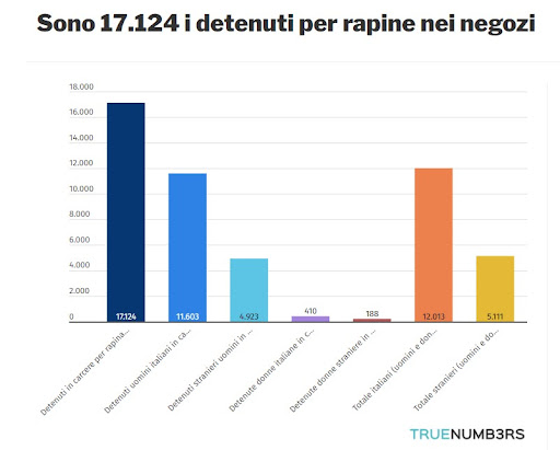 Secondo i dati Istat relativi al 2022 i detenuti nelle carceri italiane per rapina sono 17.124. Non tutti sono uomini, per la precisione gli uomini in carcere per rapina sono 16.526 e le donne sono 598, ovvero il 3,5% come mostra il grafico in apertura. Inoltre la maggior parte dei detenuti per rapine nei negozi è di nazionalità italiana, vediamo i numeri. In carcere ci sono 11.603 italiani uomini che scontano una pena per rapina. Le donne sono 410, quindi in totale gli italiani in carcere per aver rapinato un negozio sono 12.013, il 70% sul totale dei carcerati per questo reato. Gli stranieri in galera per rapina sono invece 5.111, di cui 4.923 maschi e 188 femmine.